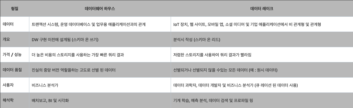 요구사항에 따라서 데이터웨어 하우스와 데이터 레이크가 모두 필요합니다.