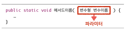 - 메서드 파라미터 : 매개변수라고도 하며, 메서드가 실행될 때 필요한 조건값이다.