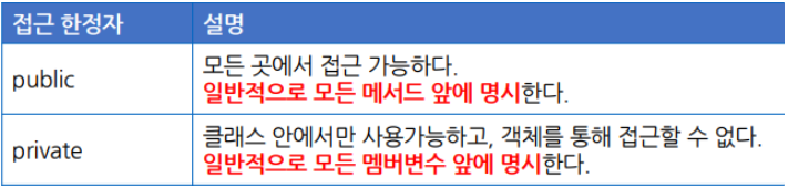 - 멤버변수나 메서드가 객체에 노출이 되지 않도록 설정 → private