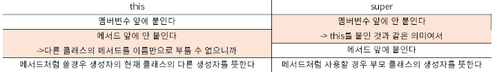 ✅ super를 멤버변수 앞에 붙이면 this와 같은 의미이기 때문에 잘 사용하지 않으며, 메서드 앞에는 구분을 위해 꼭 붙여야한다.