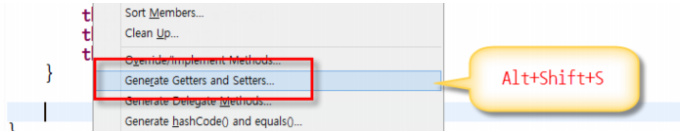 - Alt+Shift+S를 눌러서 Getter, Settet를 자동으로 만들 수 있다