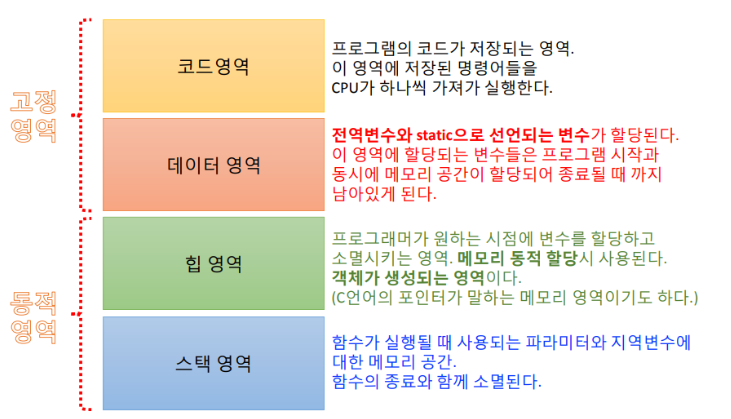 - static은 메모리의 고정영역에 생성되고, 일반 멤버변수는 동적영역 중에 Heap 메모리 영역에 생성된다.