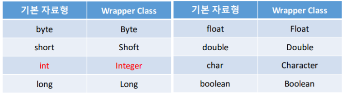- 어떤 상황(컬렉션)에서 기본 데이터 타입의 변수를 객체 형태로 사양해야 하는 경우가 있는데, 이때 기본형 타입을 객체로 포장하기 위해 사용